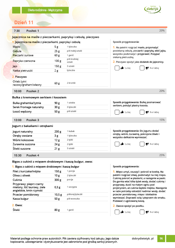 • w formie precyzyjnych jadłospisów wielodniowych (na każdy dzień miesiąca jest opracowany osobny jadłospis). Tutaj nie musisz zastanawiać się co zjeść każdego dnia, gdyż będziesz mieć dokładnie wszystko rozplanowane.